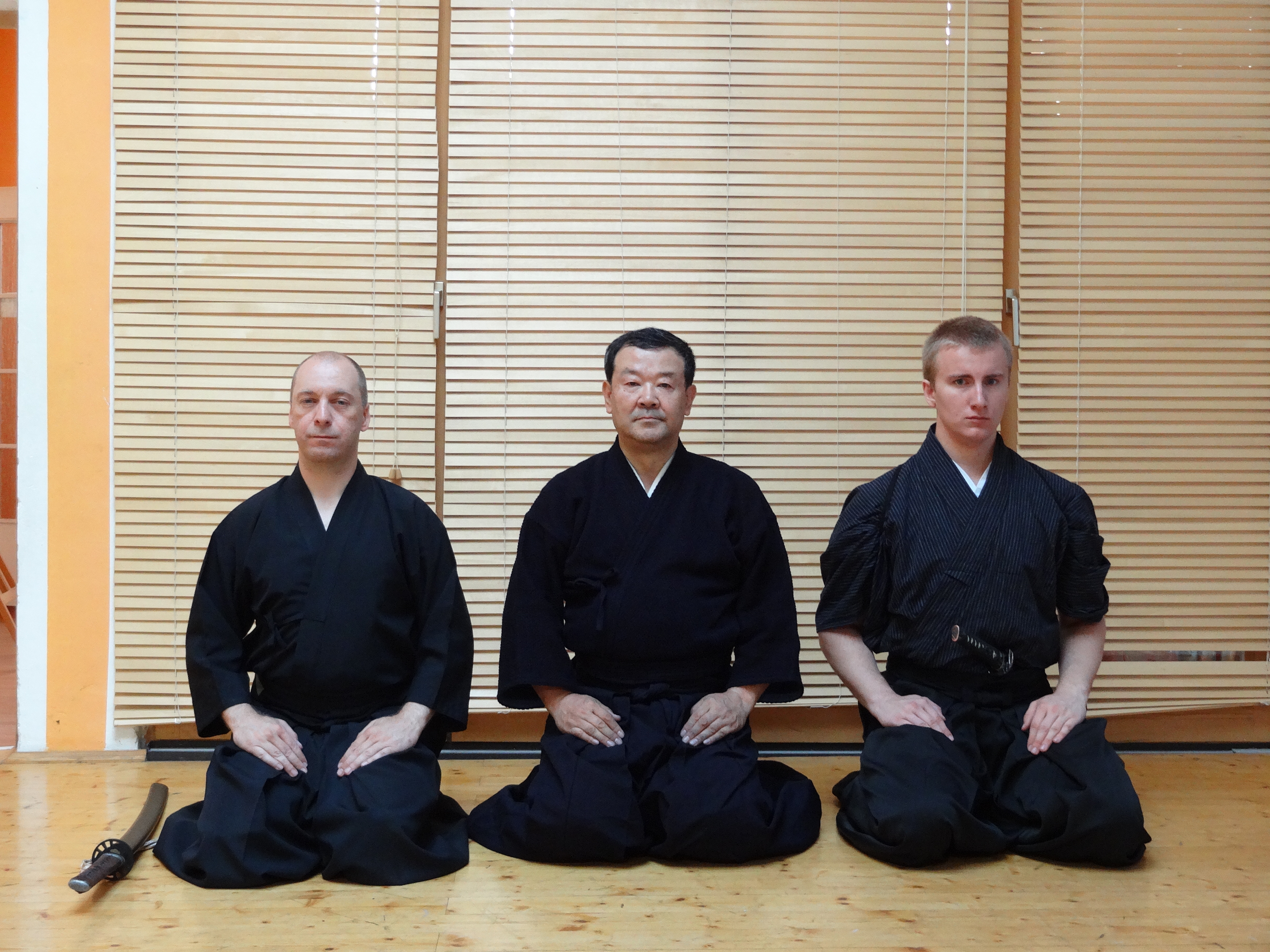 Links meine Wenigkeit zusammen mit Ôtsuka Yoichiro Masanori und Lösch Markus Masatomo, dem Europa-Shibuchô der Hokushin Ittô-ryû.