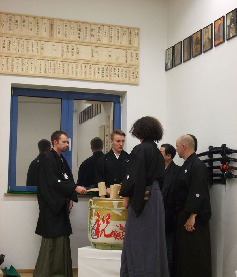 The session was closed at 19:00 and most of us set off to the Chiba-Dôjô in order to cater ourselves. There was still plenty of food and drinks left over from last nights party! We all sat together, served us from the big Sake cask, chatted and occasionally taking a Naginata, a Bokutô or a Shinai from the stand…